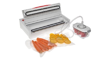 EasyVac je kućanski aparat za vakuumiranje i varenje vrećica i vakuumskih posuda. Pohranjivanje u vakuumu održava svježinu namirnica i produžava njihovu postojanost. Brezbrižno vakuumiranje vlažne hrane! Senzor za tekućinu prekida djelovanje aparata dođe li do neželjene apsorpcije tekućine. Tiho djelovanje tijekom varenja. Razvijen i izrađen u Sloveniji. Uz uređaj dolazi: 1 uža folija u roli, dimenzije 200 x 1500 mm, 1 šira folija u roli, dimenzije 280 x 1500 mm, 3 manje vrećice, dimenzije 200 x 280 mm, 3 veće vrećice, dimenzije 280 x 360 mm, priključak za vakuumiranje posuda, nož za rezanje folije, upute za uporabu.
