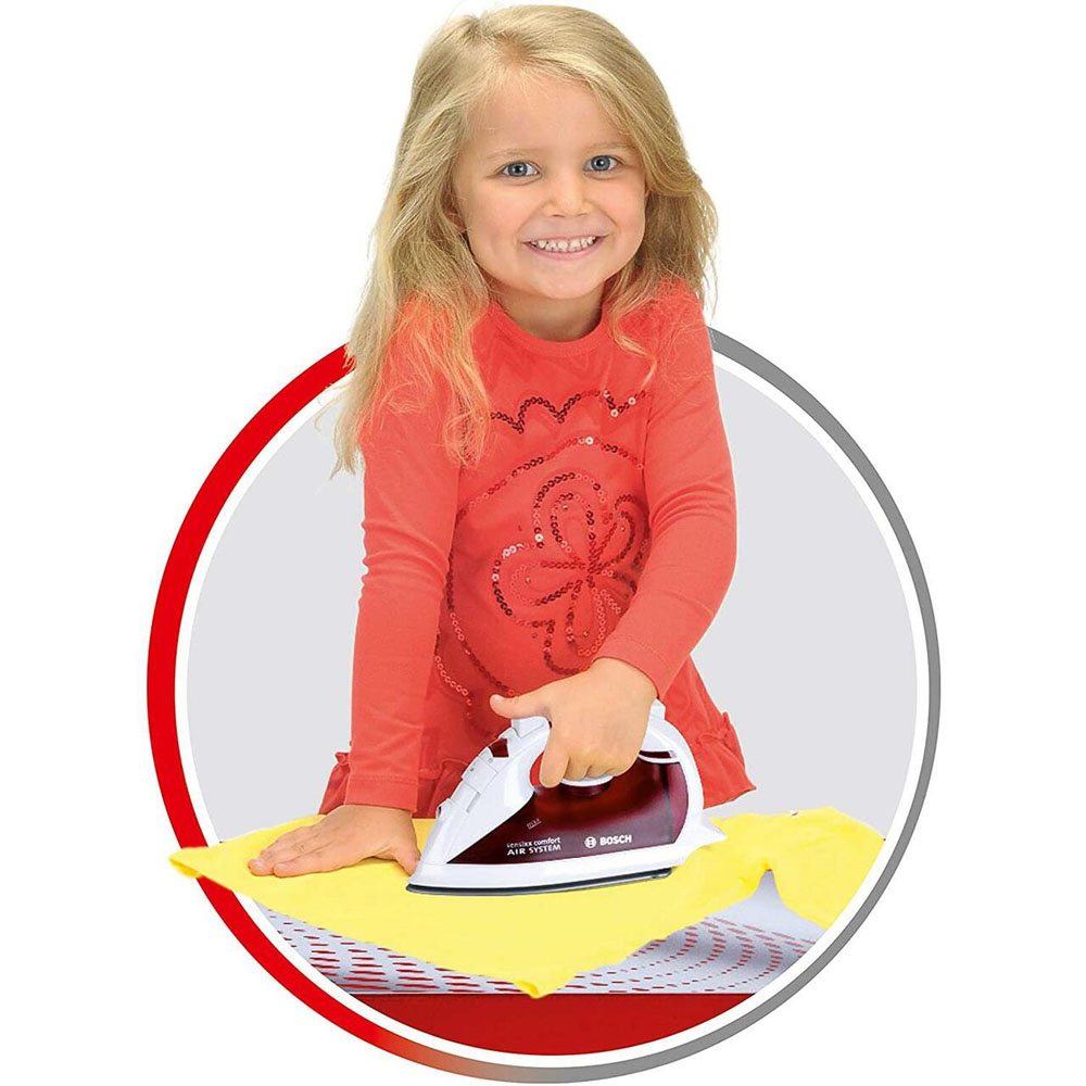 Klein Bosch set za glačanje s daskom za glačanje i glačalom. Visina daske je podesiva (47 i 52 cm), s funkcijom vode, nema stvarnog zagrijavanja glačala. Igračka je replika u Bosch dizajnu. Preporučena dob: 3 ili više godina.
