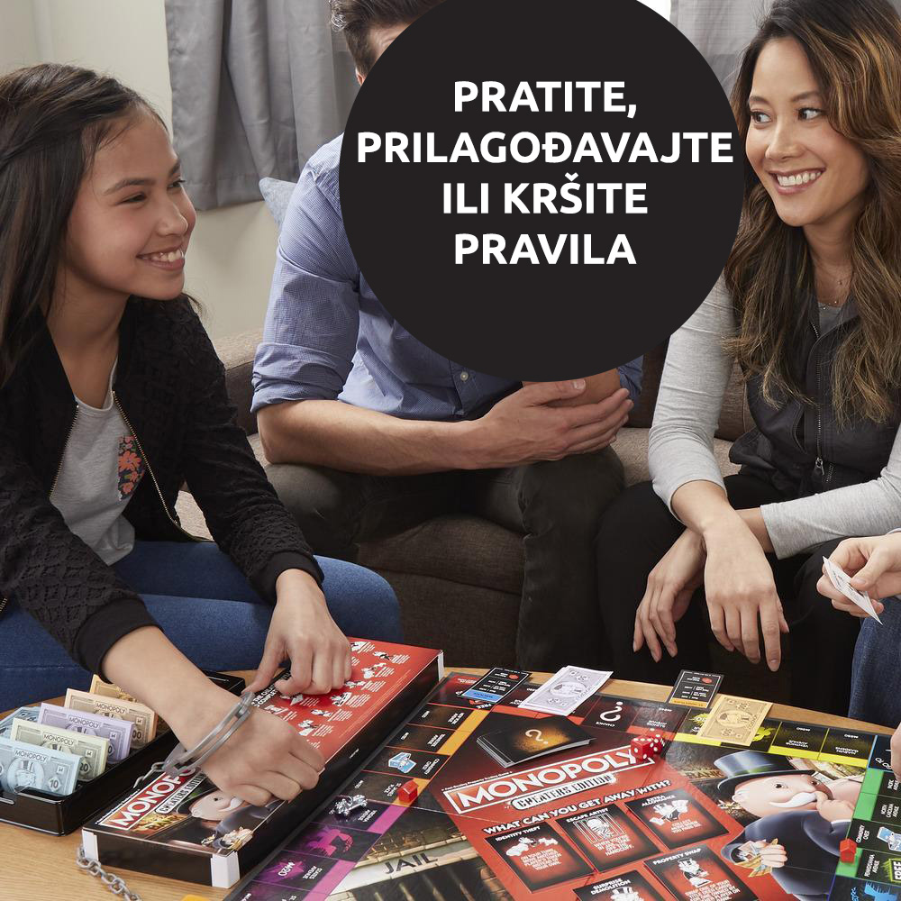 Uzbudljiva igra trgovanja posjedima Monopoly u posebnom izdanju za varalice. Pratite, prilagođavajte ili kršite pravila dok kupujete, prodajete, sanjarite i spletkarite! Provucite se nekažnjeno sa što više prjevara. Ali pažljivo, koga uhvate, dobiva lisice i ide u zatvor! Do kad možete prolaziti nekažnjeno? Igra je za 2 do 6 igrača. Preporučena dob: 8 ili više godina.