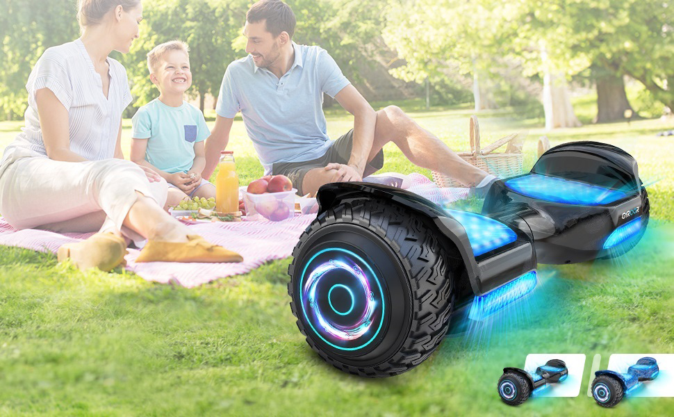 Gyroor G11 je hoverboard za sve terene. Dvostruke čvrste gume s motorima snage 2x250W osim po asfaltu i ravnim površinama omogućuju glatku vožnju po šljunčanom i pjeskovitom terenu, krstarećom brzinom od 13 km/h za djecu od 6 ili više godina i odrasle do 100 kg. Posjeduje sigurnosne certifikate za hoverboard i bateriju. Veliki kapacitet baterije omogućuje domet od 6 do 12 km nakon jednog punjenja. Ovaj model ima ugrađen visokokvalitetni Bluetooth zvučnik za glazbu te mogućnost povezivanja s mobitelom putem Gyroor aplikacije. Svjetleće pedale i cool LED svjetla pružit će bolje iskustvo vožnje, idealan odabir i za poklon zbog svog atraktivnog dizajna.