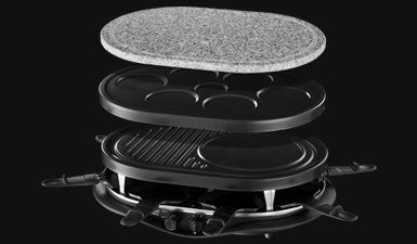 Uz mnoštvo značajki, ovaj atraktivan raclette uključuje grill/crepe ploču, kamenu ploču i mini crepe ploču.