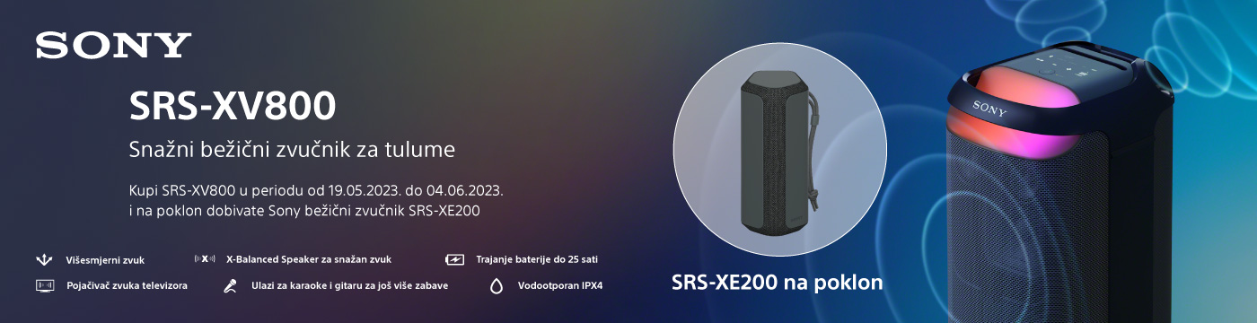 Kupite novi Sony SRS-XV800 zvučnik u periodu od 19.05. do 04.06.2023. i na poklon dobivate bežični zvučnik SRS-XE200 u plavoj boji!