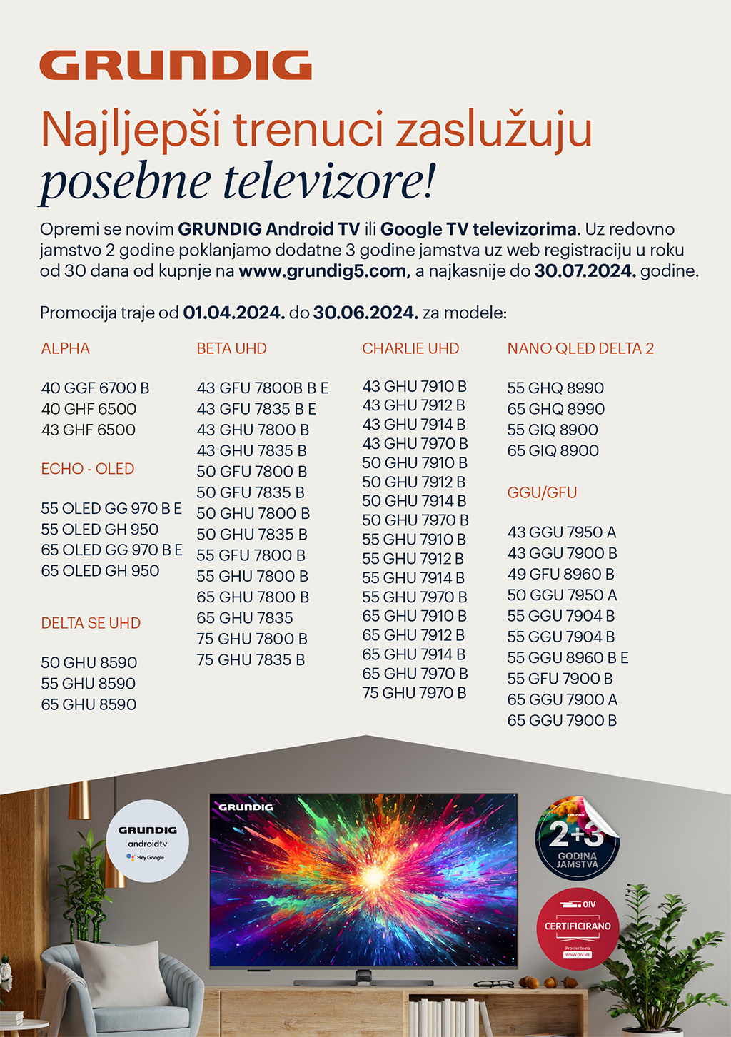 *Da biste ostvarili produljeno petogodišnje jamstvo, neophodno je da svoj TV registrirate najkasnije do 30.07.2024. Ukoliko imate pitanja u vezi registracije, molimo Vas da se javite mailom na: info-hr@grundig5.com